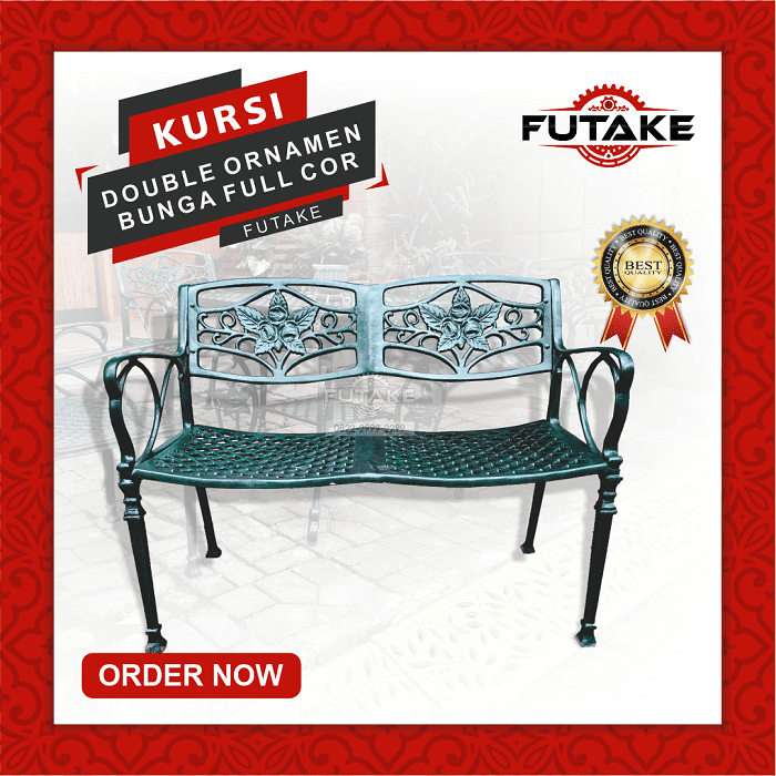 Kursi double ornamen bunga hijau full cor memiliki desain yang nyaman digunakan. Desain ornamen yang berbentuk bunga dengan perpaduan warna hijau tua membuat kursi ini terlihat indah saat dipasang di area outdoor seperti taman ataupun teras rumah.