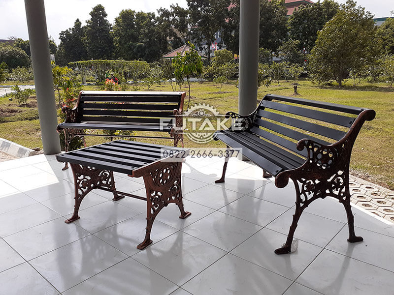Berbicara tentang kursi taman ini, Futake Group pernah mendapat pesanan satu set meja kursi taman dari salah satu kampus negeri dan juga swasta dengan penampakan modelnya seperti foto di atas. Untuk satu set produk kami ini, bahan bakunya merupakan perpaduan dari dua unsur berbeda, yaitu unsur kayu mindi terdapat pada sandaran punggung dan bantalan tempat duduknya, sedangkan rangka kursi mejanya terbuat dari bahan cor logam berkualitas. Sehingga soal ketahanan, produk kami ini layak mendapat predikat juara.